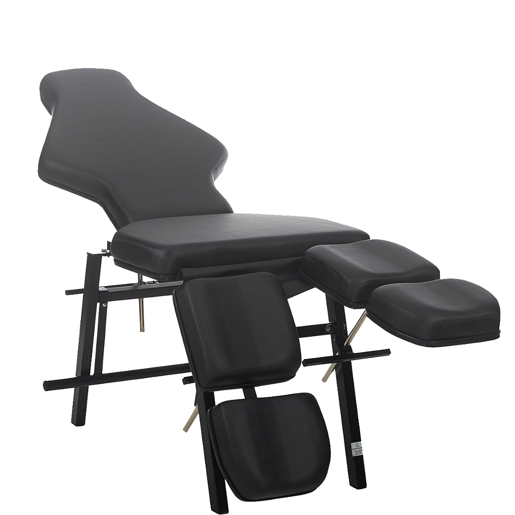 Sua cabeceira com formato anatômico é ideal para procedimentos onde há necessidade do cliente ficar de costas, permitindo encaixe das pernas, as perneiras são bipartidas com posição ajustável.