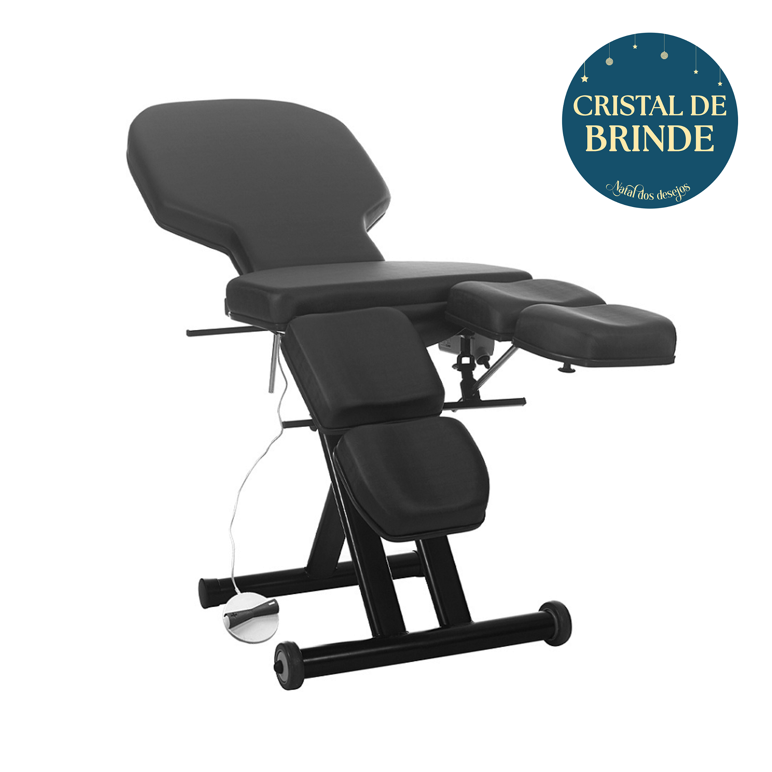 A estrutura da base em formato tubular traz estabilidade, sua cabeceira com formato anatômico é ideal para procedimentos onde há necessidade do cliente ficar de costas, permitindo encaixe das pernas, as perneiras são bipartidas com posição ajustável.